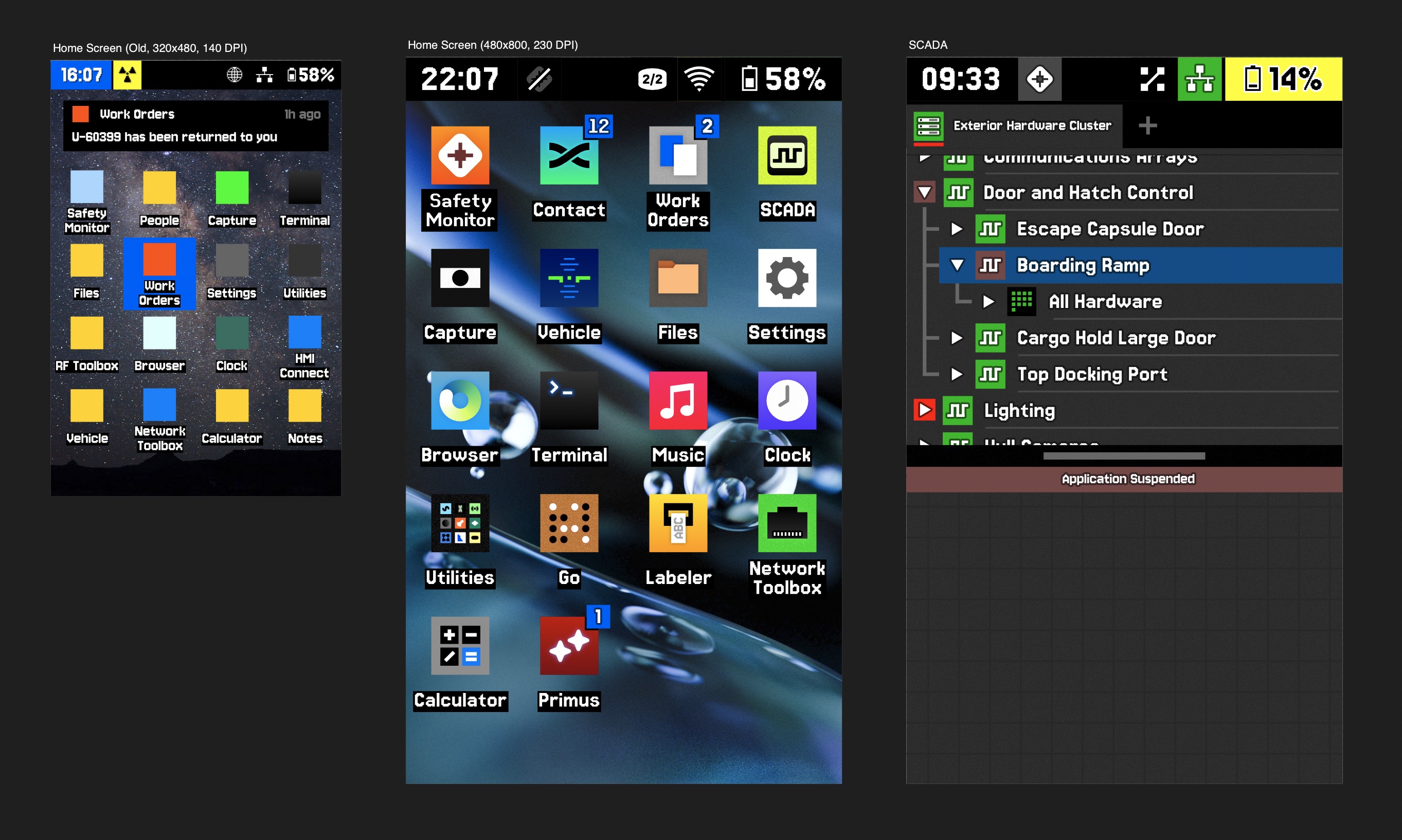 Second, I really wanted to apply some of the stuff I was learning about physical electronics at the time and attempt to build a replica of this device. Raspberry Pi single-board computers and small touchscreen LCDs were cheap enough and easy to obtain, and I figured I could emulate the light bar with a couple of NeoPixel LED strips. Unfortunately, I learned the hard way that assembling stuff from generic parts can't get even remotely close to the economy of real hardware that's engineered and integrated together. (After all, there's a very good reason why R&D budgets are massive.) On the verge of giving up, I discovered a category of ESP32 microcontroller boards with a tightly integrated, much thinner display, which looked a lot more promising. I bought one and learned how to flash it...only to discover that its pixels weren't square, making it near-useless for displaying my mockup UI! With that last straw, I cut my losses and shoved all that stuff in a box. One of these days I'll keep fooling around with it, but right now I have much bigger fish to fry.