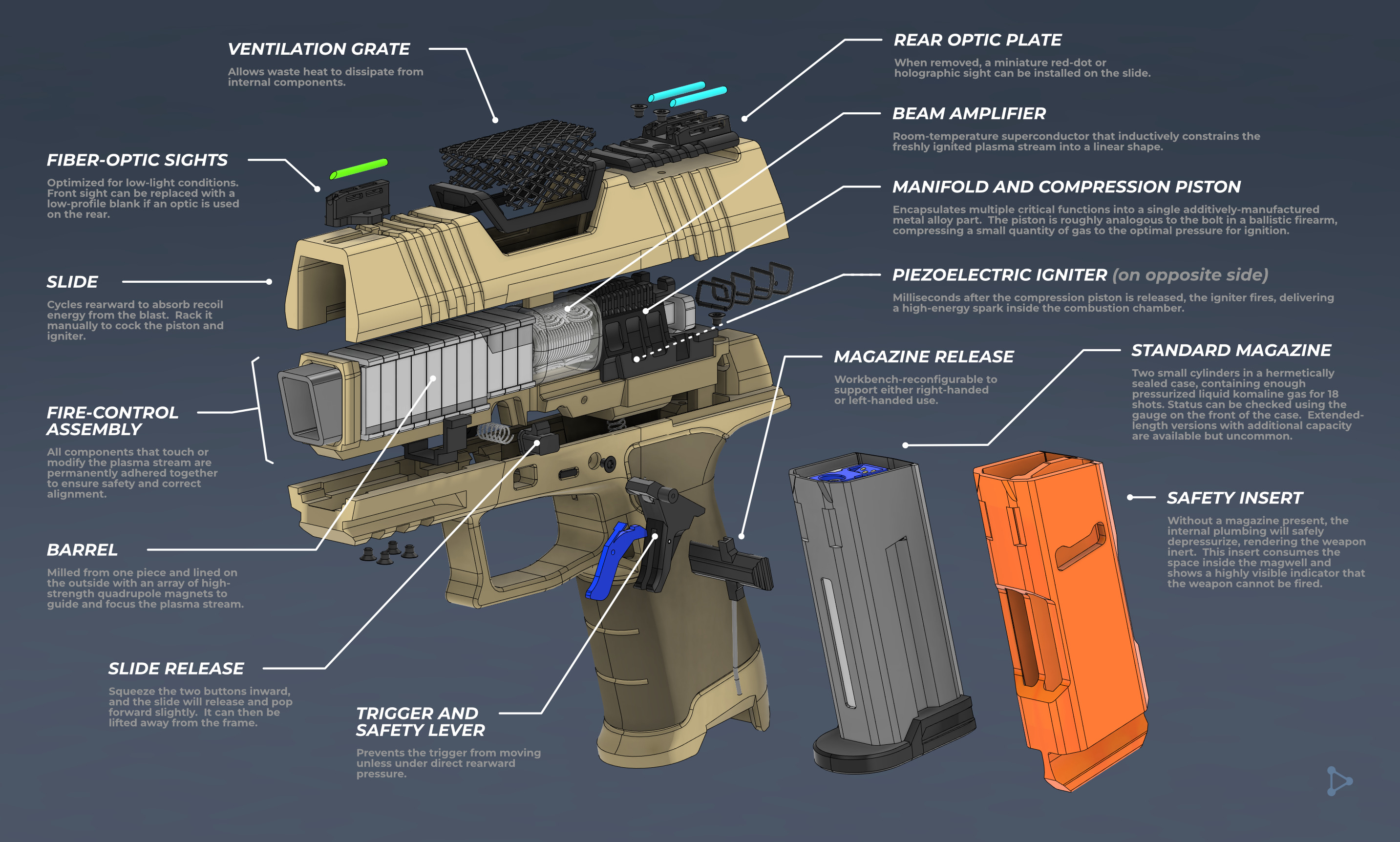 Even deadlier at close range than a ballistic firearm, yet far safer beyond that in the event of a missed or negligent shot. Engineered using multiple legal loopholes, and powered by resources far easier to obtain than the costly high-density metals needed to manufacture bullets. Firearms based on the exothermic decomposition of pressurized komaline gas are the weapon of choice among the Tyron system's industrial clan. The KL-90 is a generations-old system, trusted by security personnel, undercover industrial observers, and anyone with the right connections who might find themselves in a rough situation.