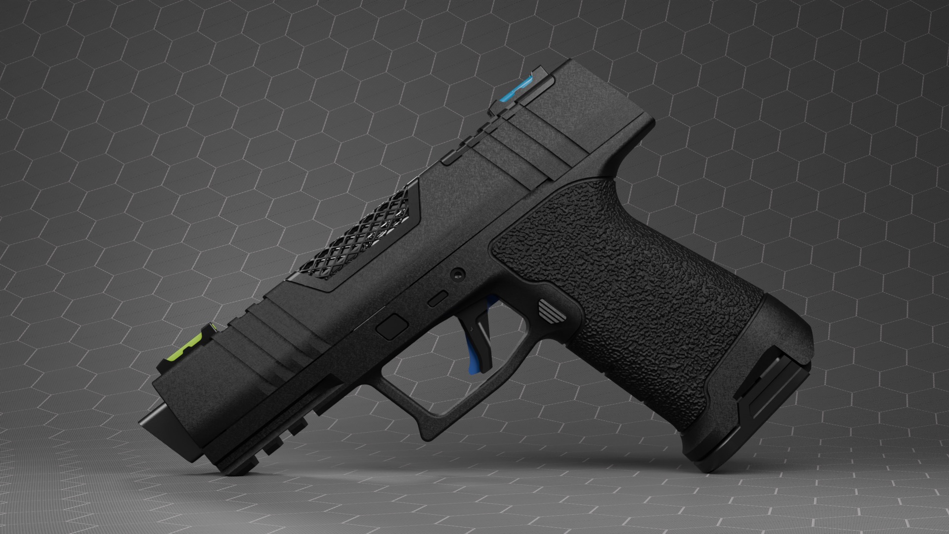 I also made the project much harder on myself by choosing to design plausible internal components as well. Unlike the well-known mechanics of gunpowder, I had to think about how my made-up physics and chemistry might actually work while preserving the outward appearance and behavior I wanted. Specifically, I really liked the motion of a normal handgun's slide, both in blowback at the moment of firing and the dramatic action of racking the slide to cock the firing mechanism. The solution was to borrow ideas from rifle platforms, adding a gas compression piston roughly analagous to a bolt and shaping the slide to act as both a buffer and a charging handle. When you pull the trigger on a KL-90, the piston is forced rearward, dumping most of its energy into the slide like a Newton's cradle with the remaining amount resetting the internal parts for the next shot.