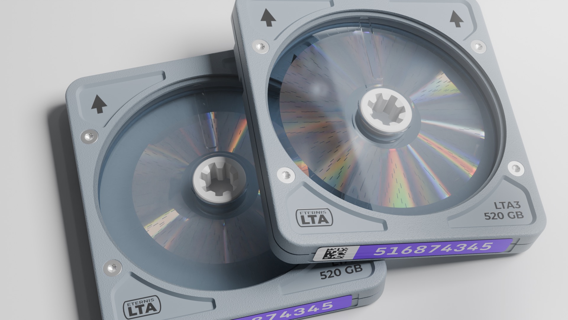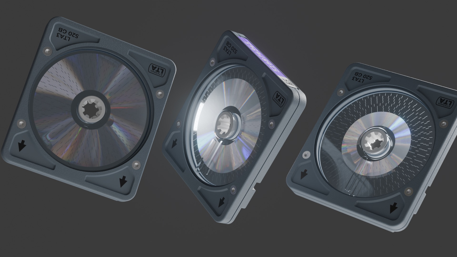 In a technologically stunted world, data is expensive, and the hardware to process and store it even more so. Unlike our world of cloud streaming and solid-state everything, in this setting relatively cheap physical media is king, and it's dominated by a standard I've dubbed LTA (long term archive), playing off the real-world LTO (linear tape open) family of high-capacity archival magnetic tapes. The basic technology consists of a thin platter of fused silica (quartz glass) into which nanoscale patterns have been etched by a precisely controlled high-power laser. This general technique is actually something that's been experimentally demonstrated in real life, but not yet commercialized at any real scale. Even so, the state of this technology in the real world has already far surpassed anything the people of my setting were able to achieve.