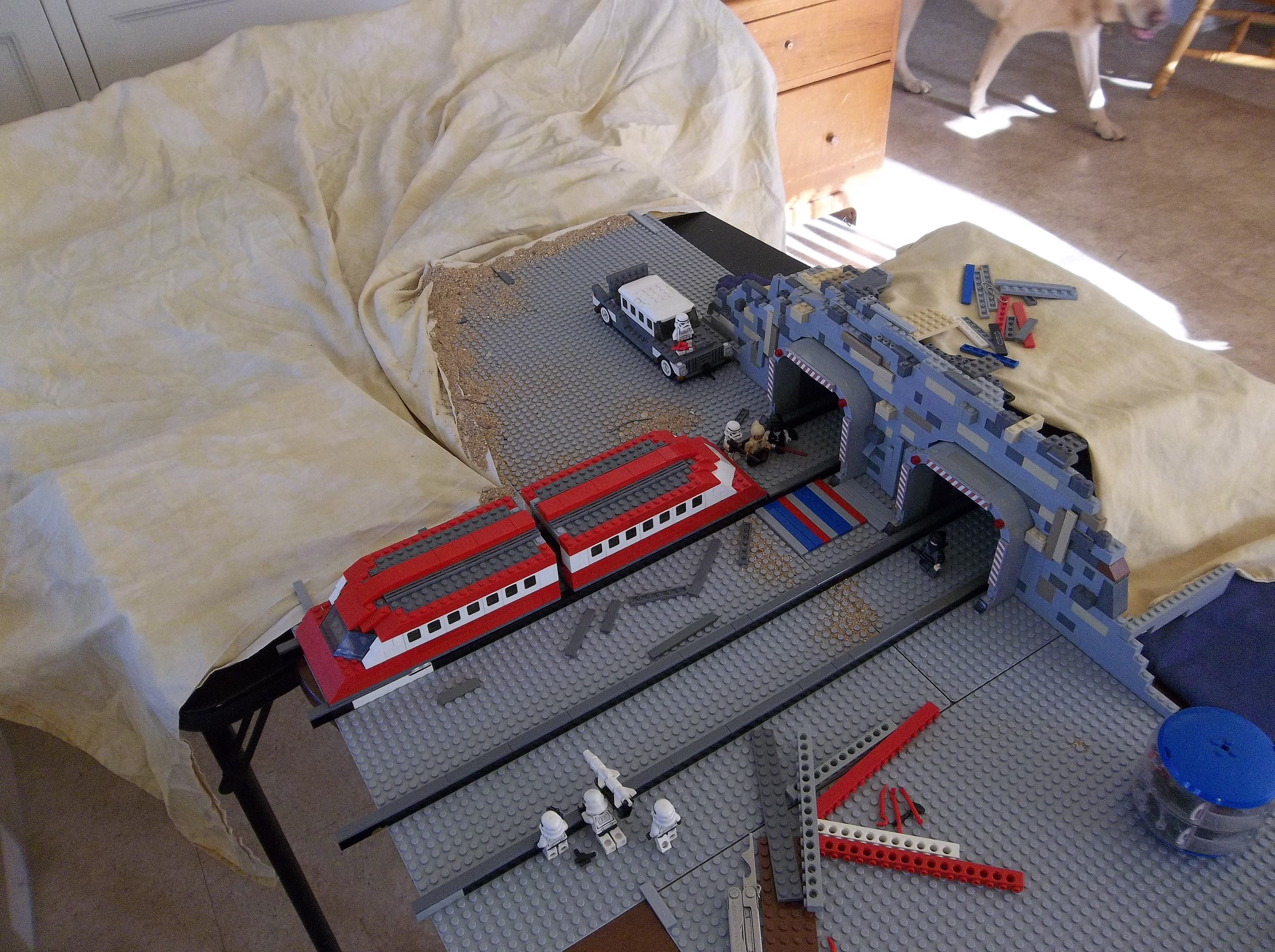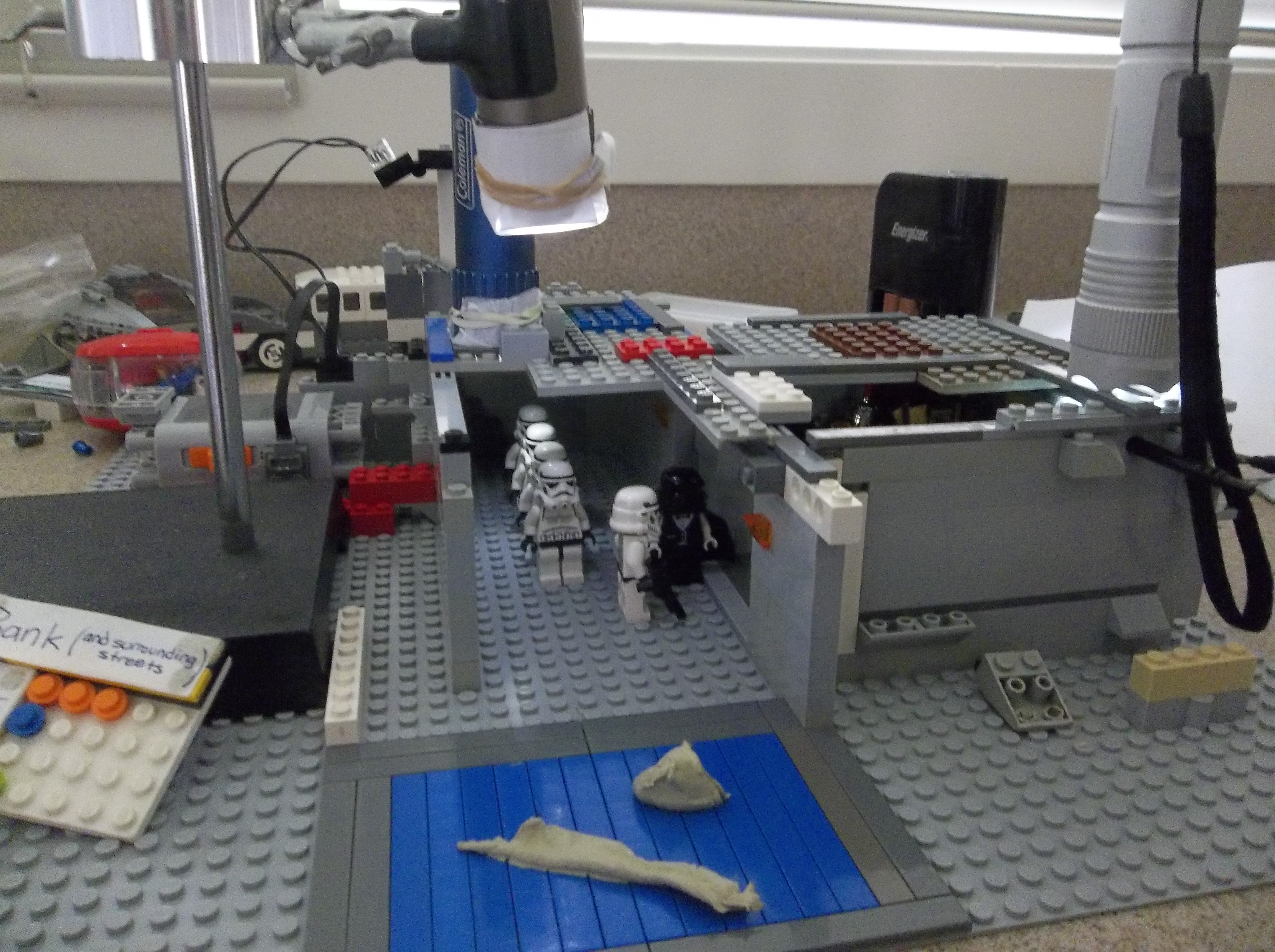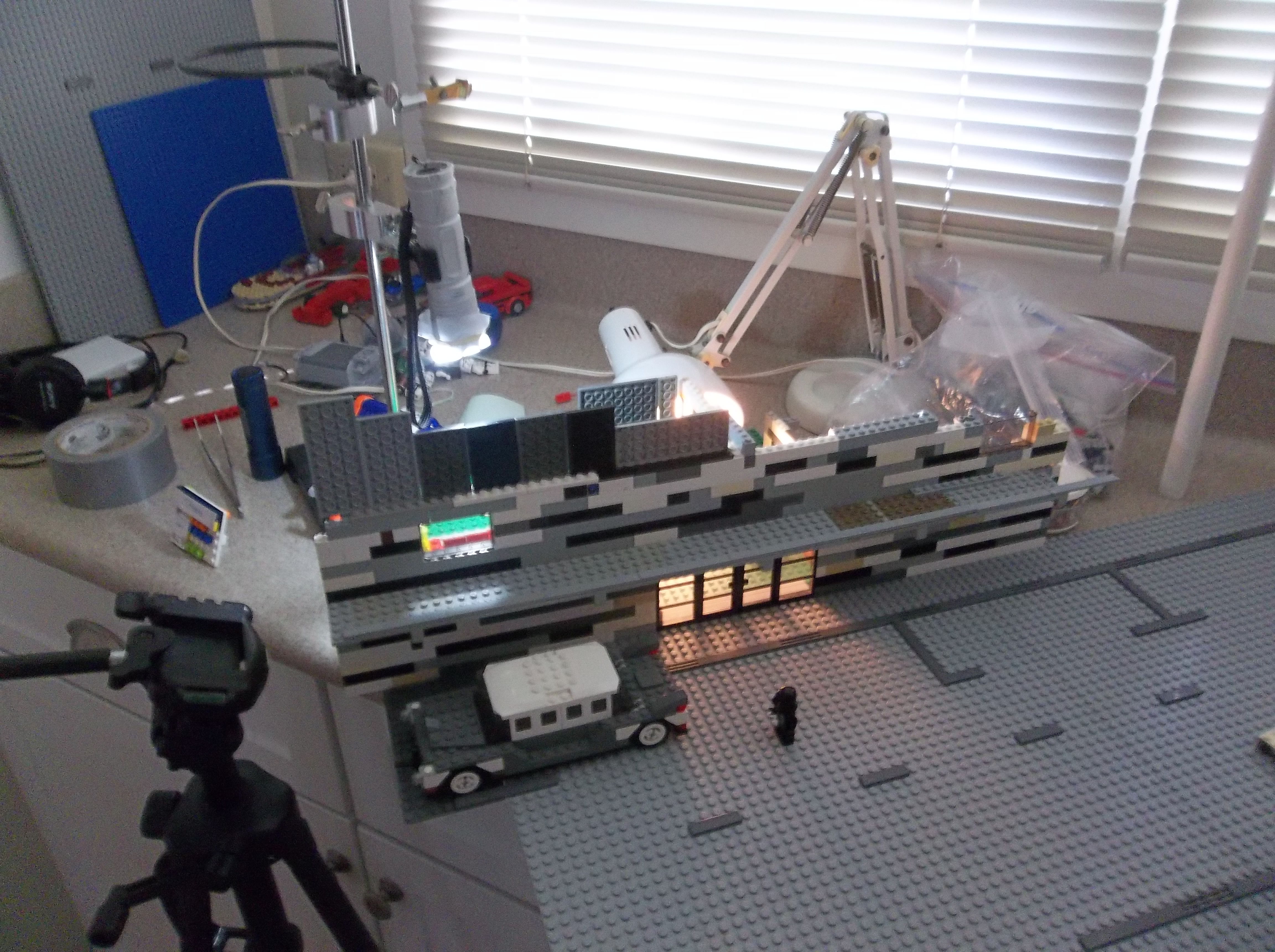 My brother and I started production in August 2012, assembling sets one at a time on the kitchen countertop and shooting stop-motion footage with minifigs and vehicles. We did the best we could with the resources we had, but in hindsight it was barely enough. My inexpensive point-and-shoot digital camera had no auto-focus or auto-exposure lock, nor the ability to remotely trigger the shutter. The self-timer feature helped a lot, but I still had to touch the camera every single frame. A tripod helped with stability, and we developed some other tricks like securing the camera to a platform or sled using sticky office putty, but those couldn't help the limitations of the camera itself. Small wonder most stop-motion is filmed using DSLRs with full manual control.