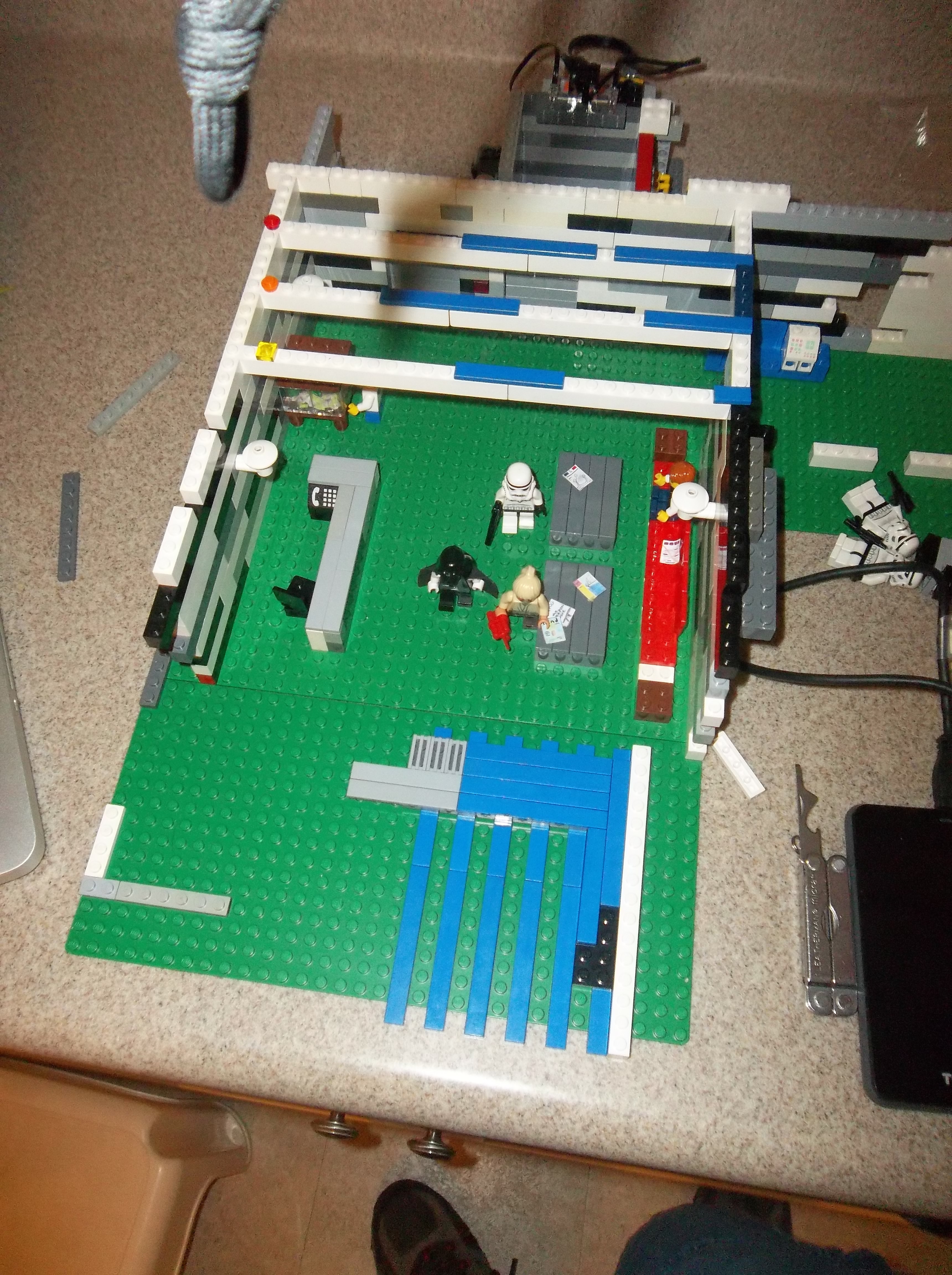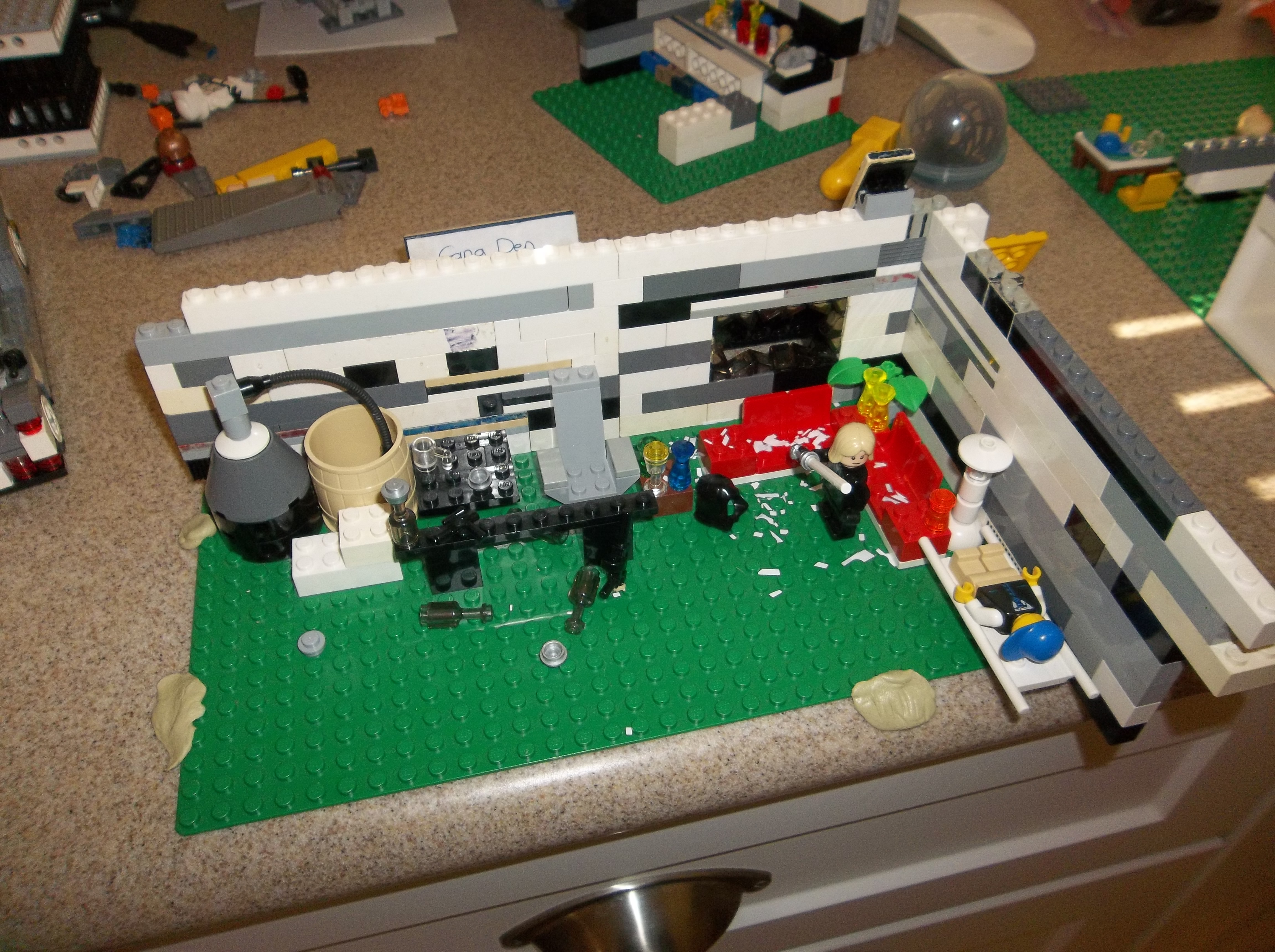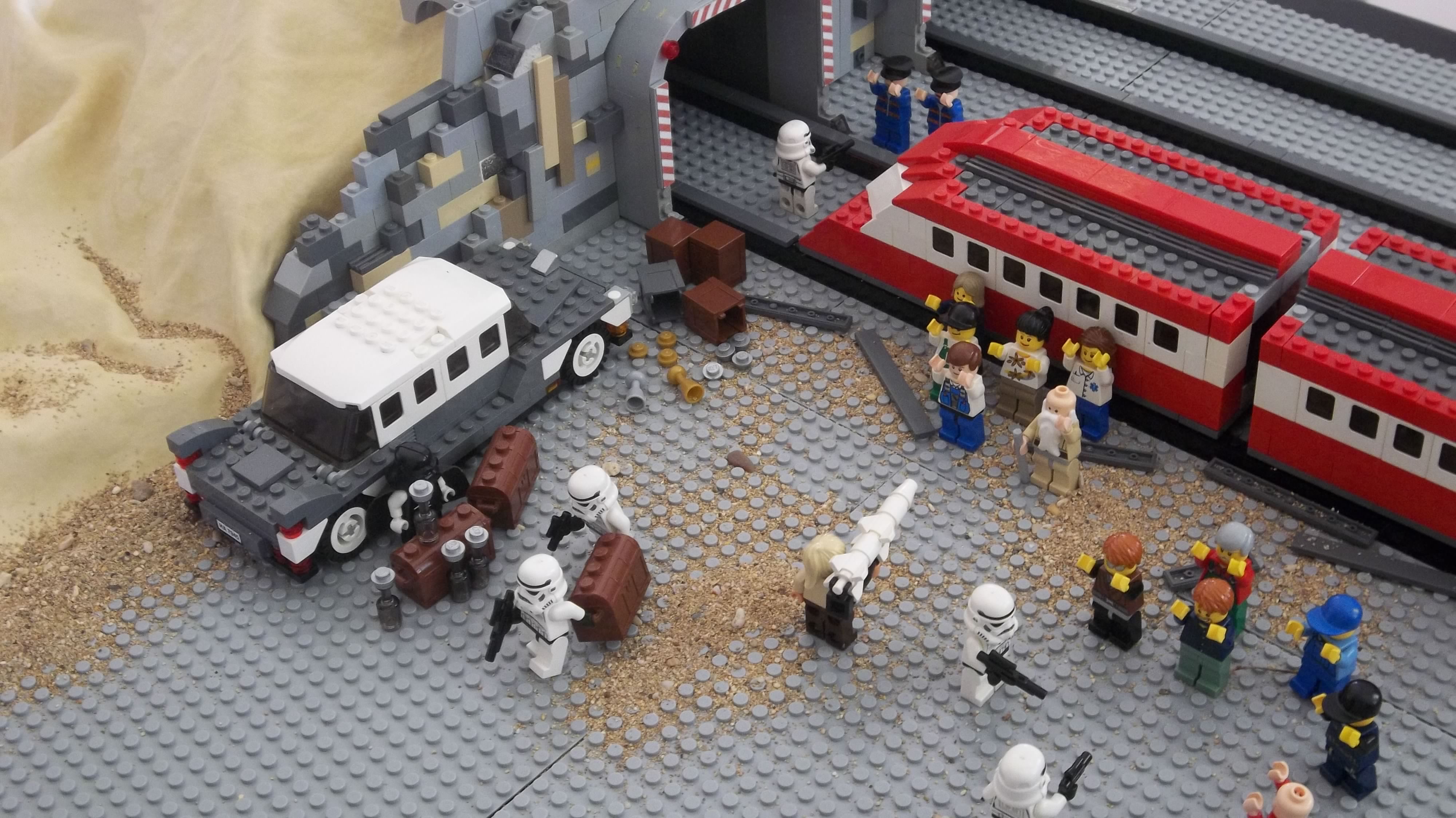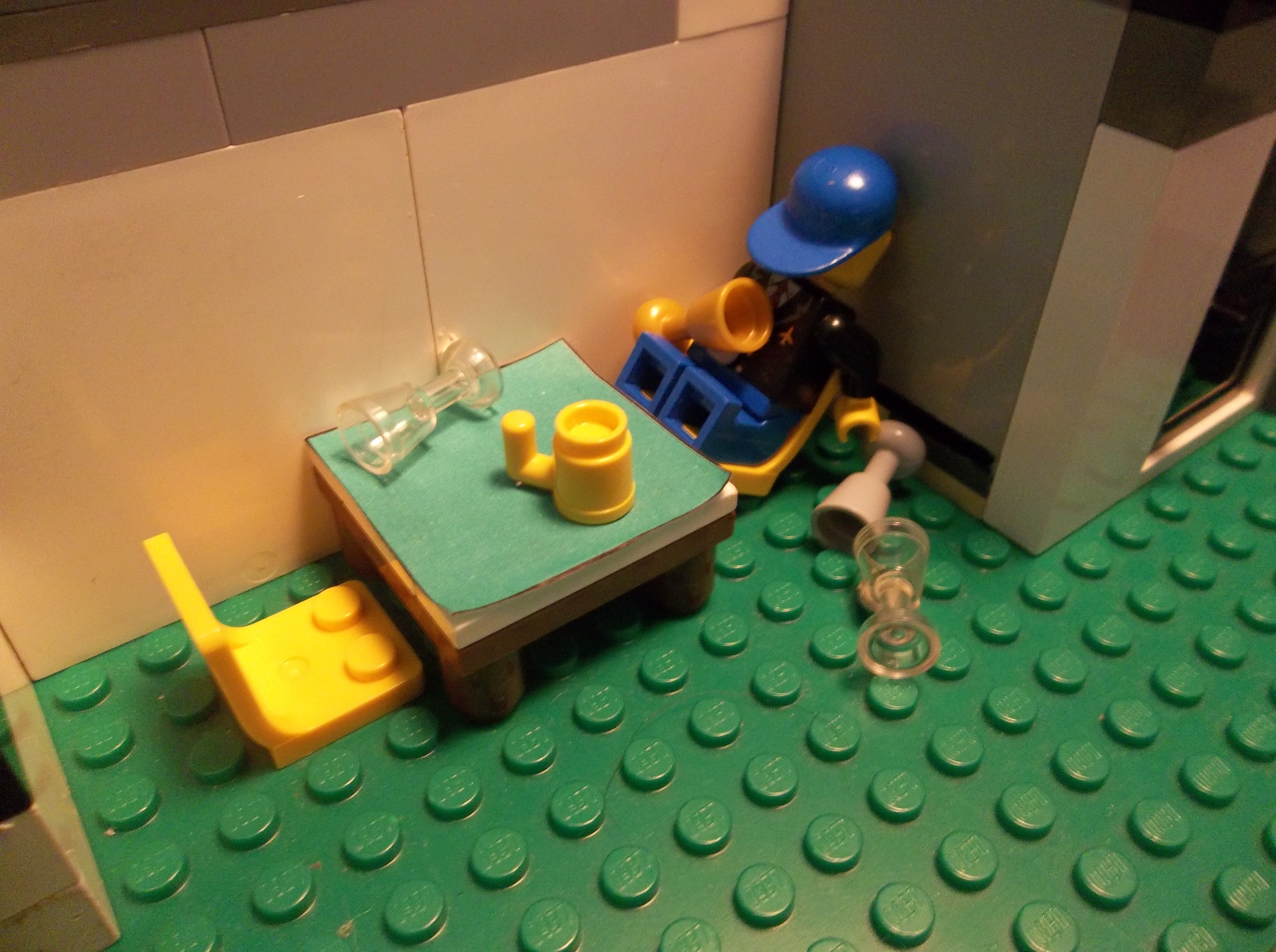 My brother and I started production in August 2012, assembling sets one at a time on the kitchen countertop and shooting stop-motion footage with minifigs and vehicles. We did the best we could with the resources we had, but in hindsight it was barely enough. My inexpensive point-and-shoot digital camera had no auto-focus or auto-exposure lock, nor the ability to remotely trigger the shutter. The self-timer feature helped a lot, but I still had to touch the camera every single frame. A tripod helped with stability, and we developed some other tricks like securing the camera to a platform or sled using sticky office putty, but those couldn't help the limitations of the camera itself. Small wonder most stop-motion is filmed using DSLRs with full manual control.